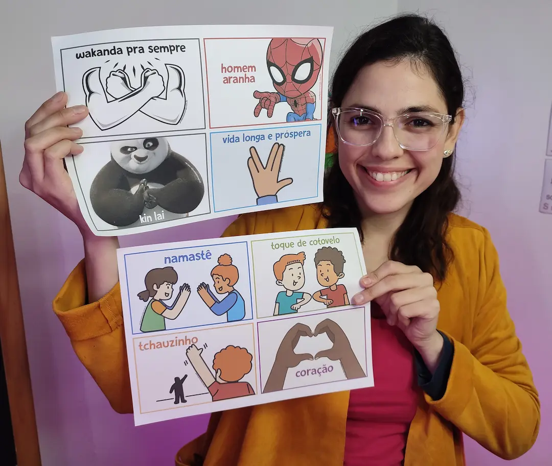 A criança escolhe como quer ser saudada, mostrando que a sala de aula é um espaço acolhedor e respeitoso.