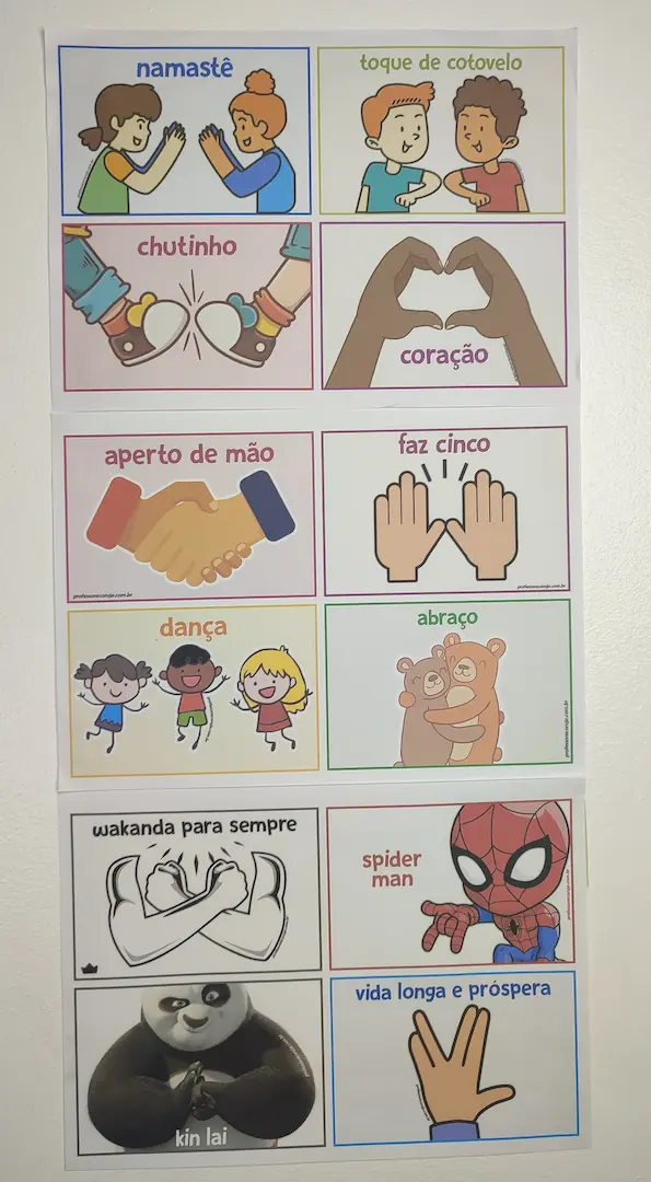 Com estes cartões, respeitamos a forma como cada criança prefere ser recebida, oferecendo várias opções de cumprimento. como um abraço, um mais, um toque de punho, um toque de pé, uma dança ou até imitar o Homem-Aranha!